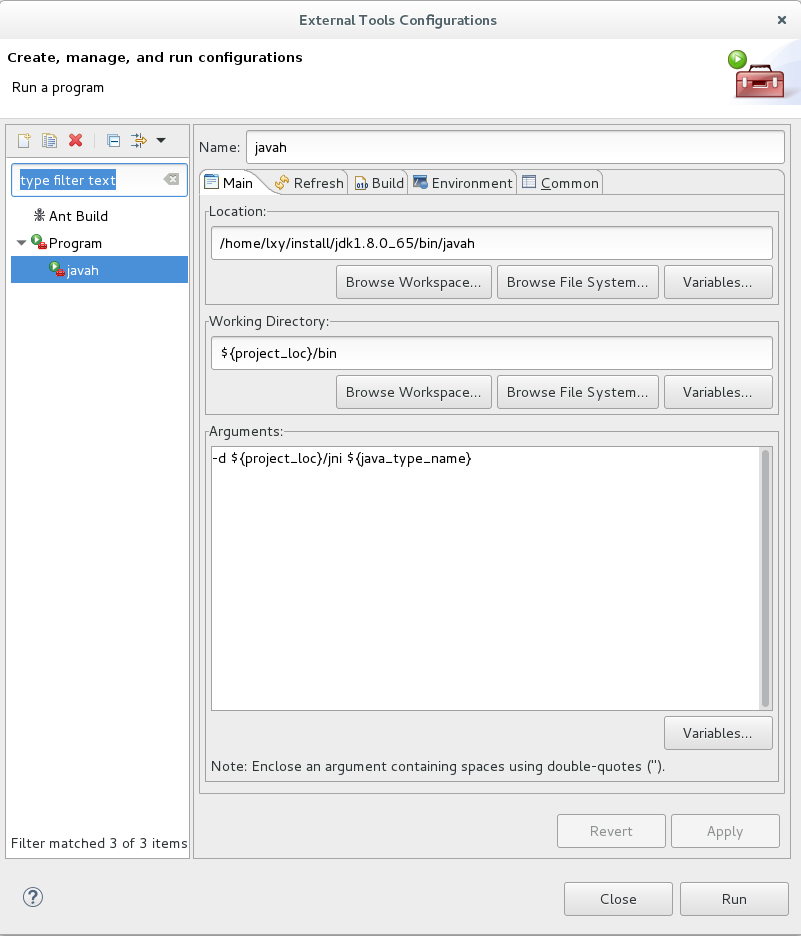 在external configuration tools中Program选项下新建一个Program,命名为javah,具体配置如下图: