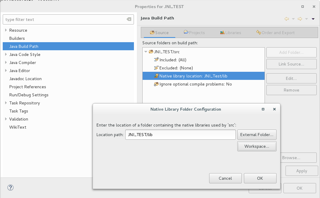 JNI_Testjava项目给下新建一个lib文件夹,将JNI_Libraryc++项目的Debug目录中生成的libJNI_Library.so复制进lib目录。然后右键JNI_Test->properties