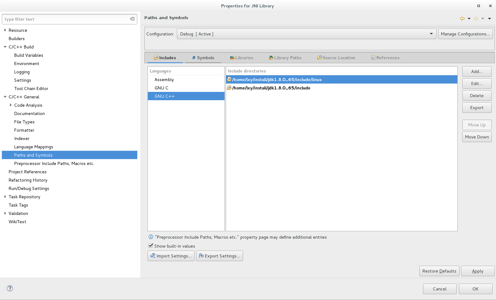 在JNI_Library项目,右键->properties-> C/C++ General -> Paths and Symbols